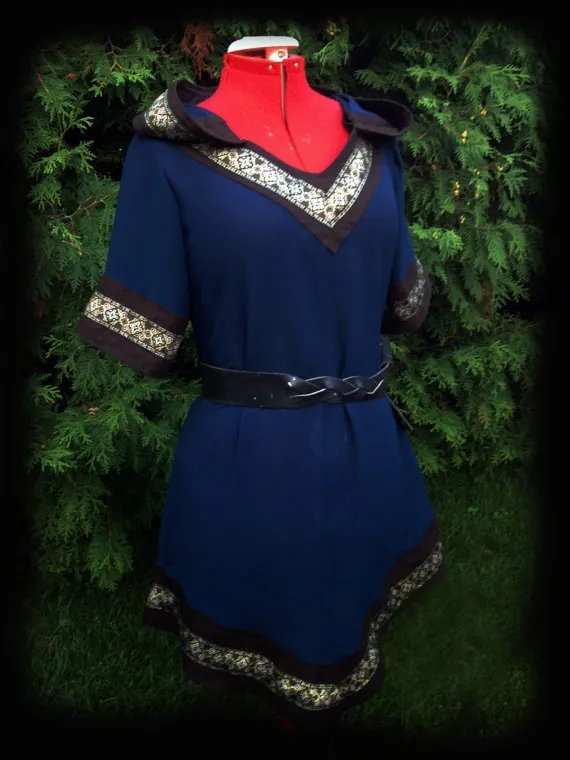 Two dress tunics in deep blue; one ruined and blood stained during Harvest Festival, Sept. 2019